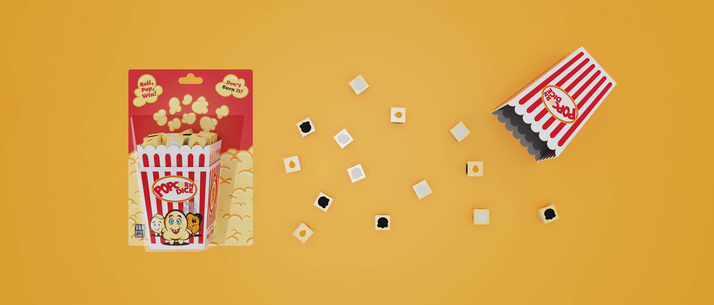 Popcorn Dice is a fast & fun dice game for the whole family! Roll your dice to pop your popcorn, but careful not to let it burn. Each popcorn rolled is one point and double pops are worth two, kernels go back to be rolled again. If you roll 4 burnt popcorns you bust and don't score any points for the round, but you can mitigate them by using a double pop to cancel a burnt pop. After each roll, decide to stop and score or press your luck and roll again.